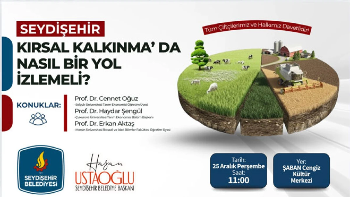 Başkan Ustaoğlu, 25 Aralık Perşembe günü Saat: 11.00’da Şaban Cengiz Kültür Merkezinde Selçuk Üniversitesi Tarım Ekonomisi Öğretim Üyesi Prof. Dr. Cennet Oğuz, Çukurova Üniversitesi Tarım Ekonomisi Bölüm Başkanı Prof. Dr. Haydar Şengül ve Mersin Üniversitesi İktisadi ve İdari Bilimler Fakültesi Öğretim Üyesi Prof. Dr. Erkan Aktaş’ın sunumlarıyla gerçekleştirilecek “ Seydişehir Kırsal Kalkınmada Nasıl Bir Yol İzlemeli?” konulu sempozyumuna tüm çiftçileri ve Seydişehirli hemşehrilerini davet etti.