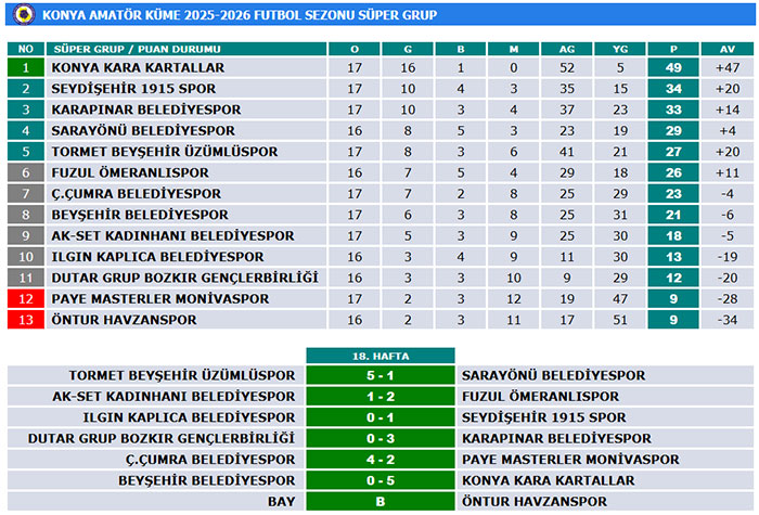 18.hafta maçlarında fileler toplam 24 kez havalandı. Haftanın en gollü karşılaşmalarında Beyşehir Üzümlüspor, Sarayönü Belediyespor’u 5-1 mağlup ederken; Çumra Belediyespor da sahasında Masterler Monivaspor’u 4-2 yenerek haftaya damga vurdu.